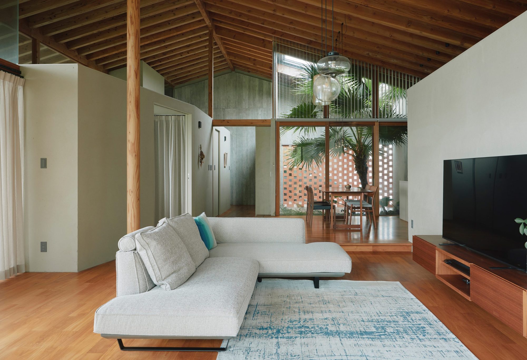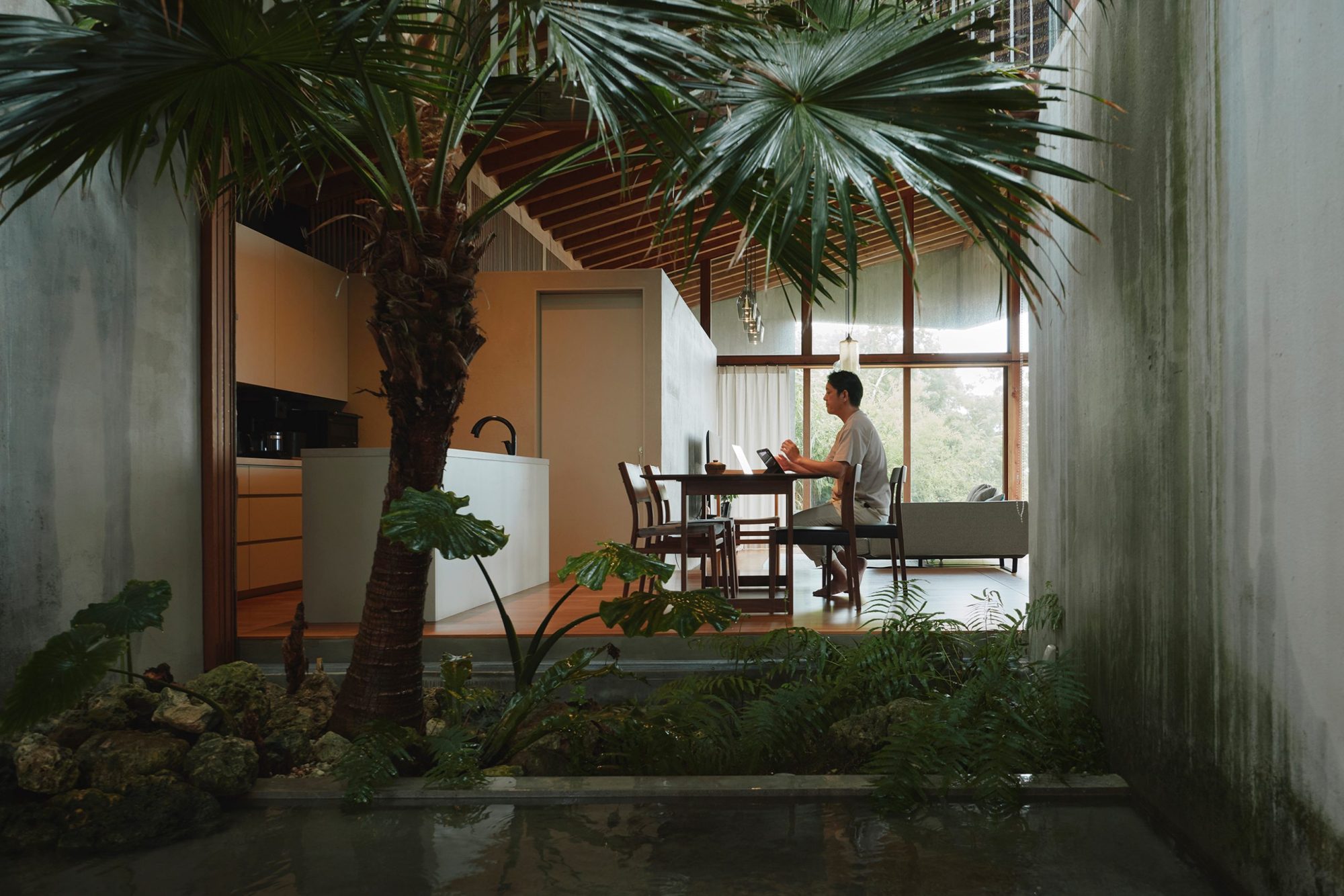 沖縄の建築家が家族との新しい生活のために建てた家。緩やかな時間が流れる大屋根の下には、南国の自然を身近に感じながらくつろぐ、ゆとりの空間が広がっていました。