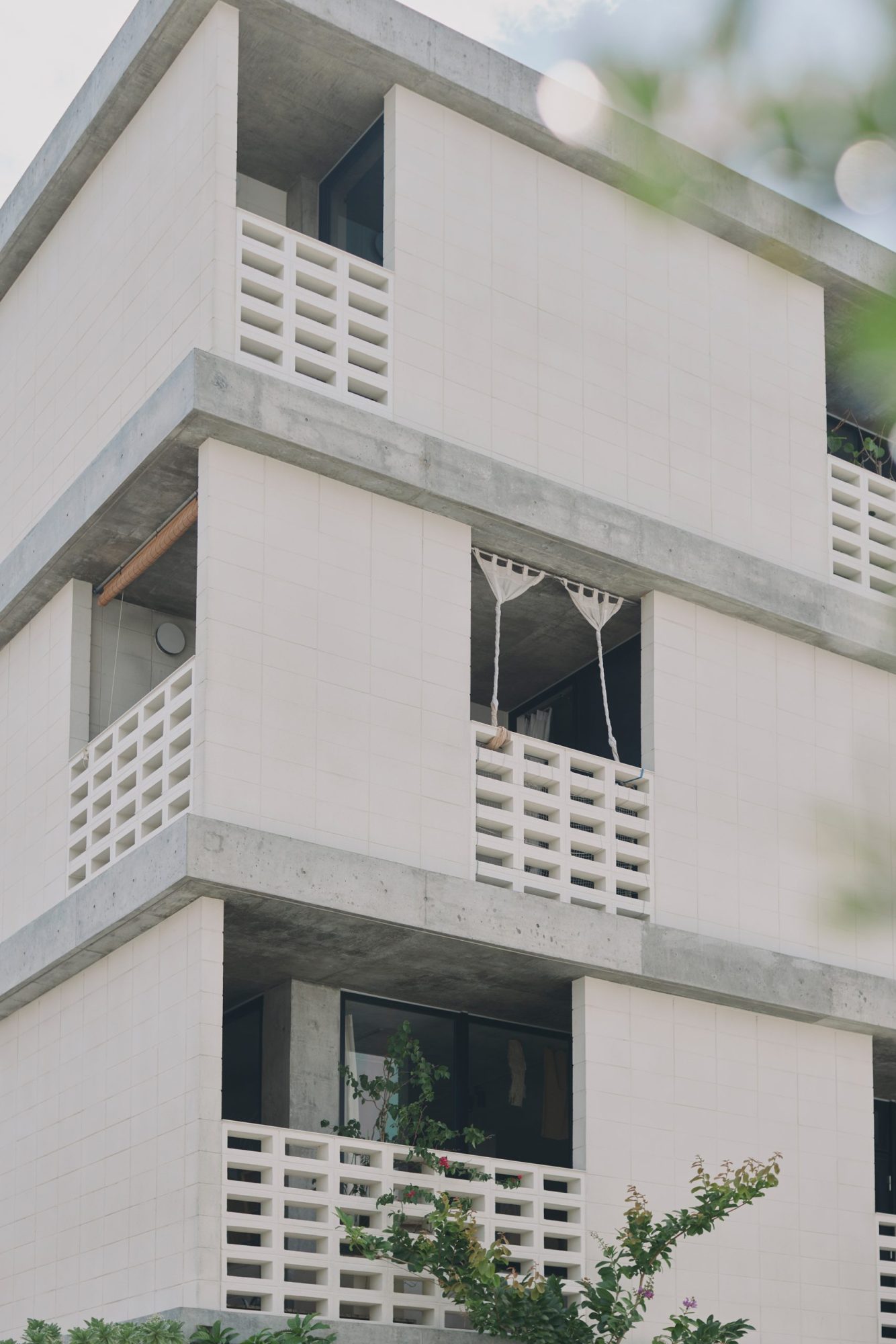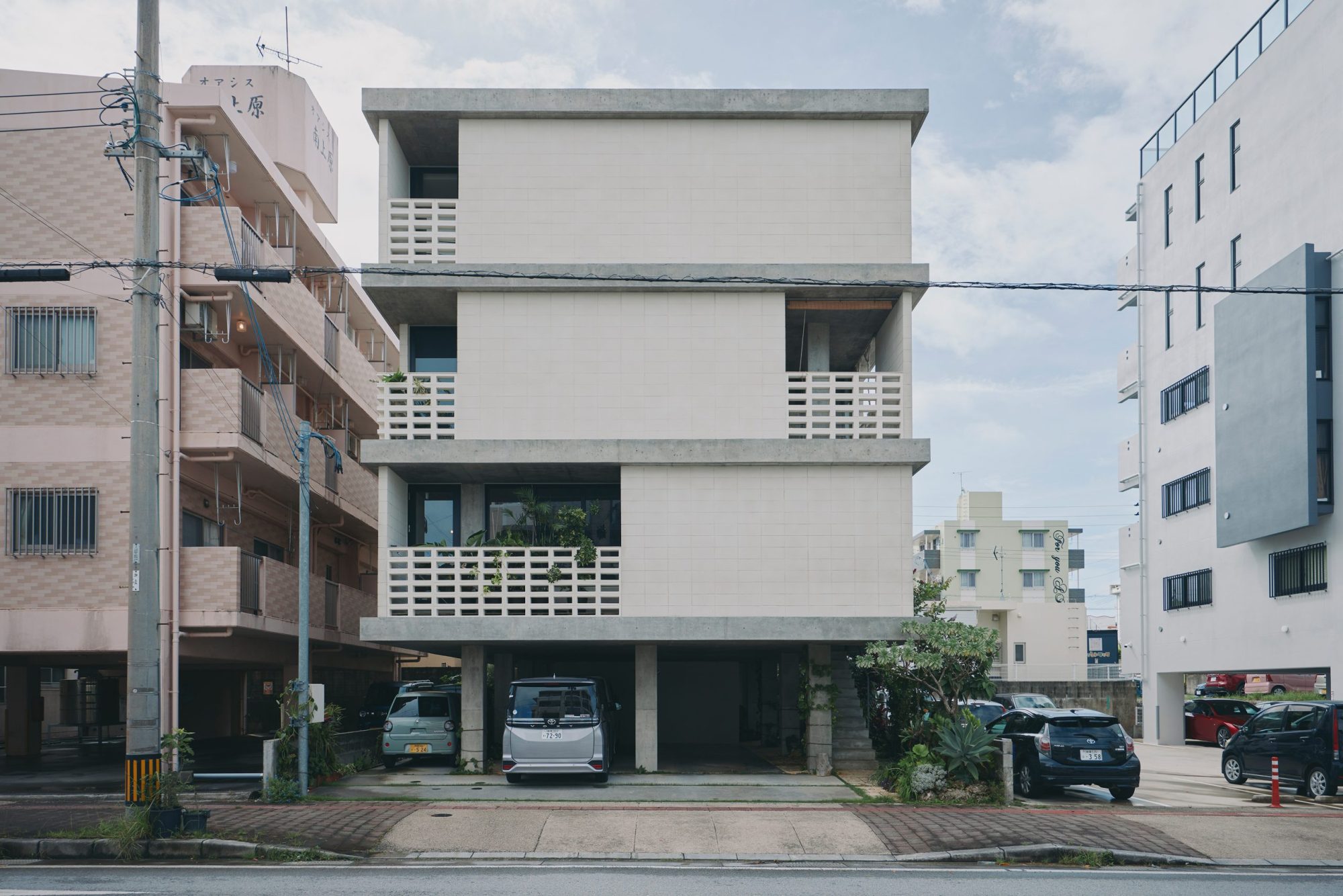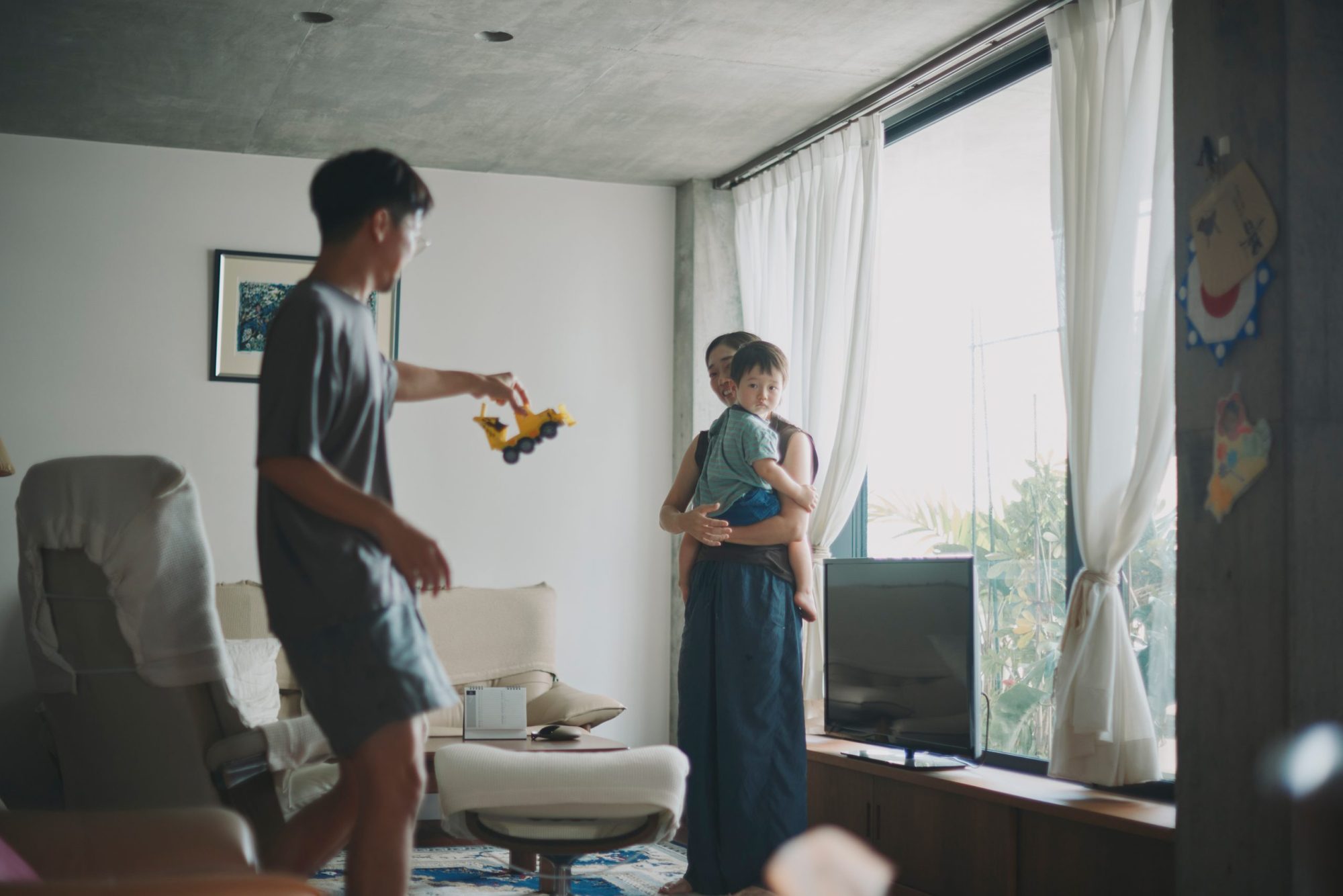沖縄本島中部の新興住宅街にあるシンプルなコンクリート4層の建物。ここは建築家の大城禎人さんが妻と3歳の息子のほか、ご両親と弟さんが一緒に暮らしている3世帯住宅です。