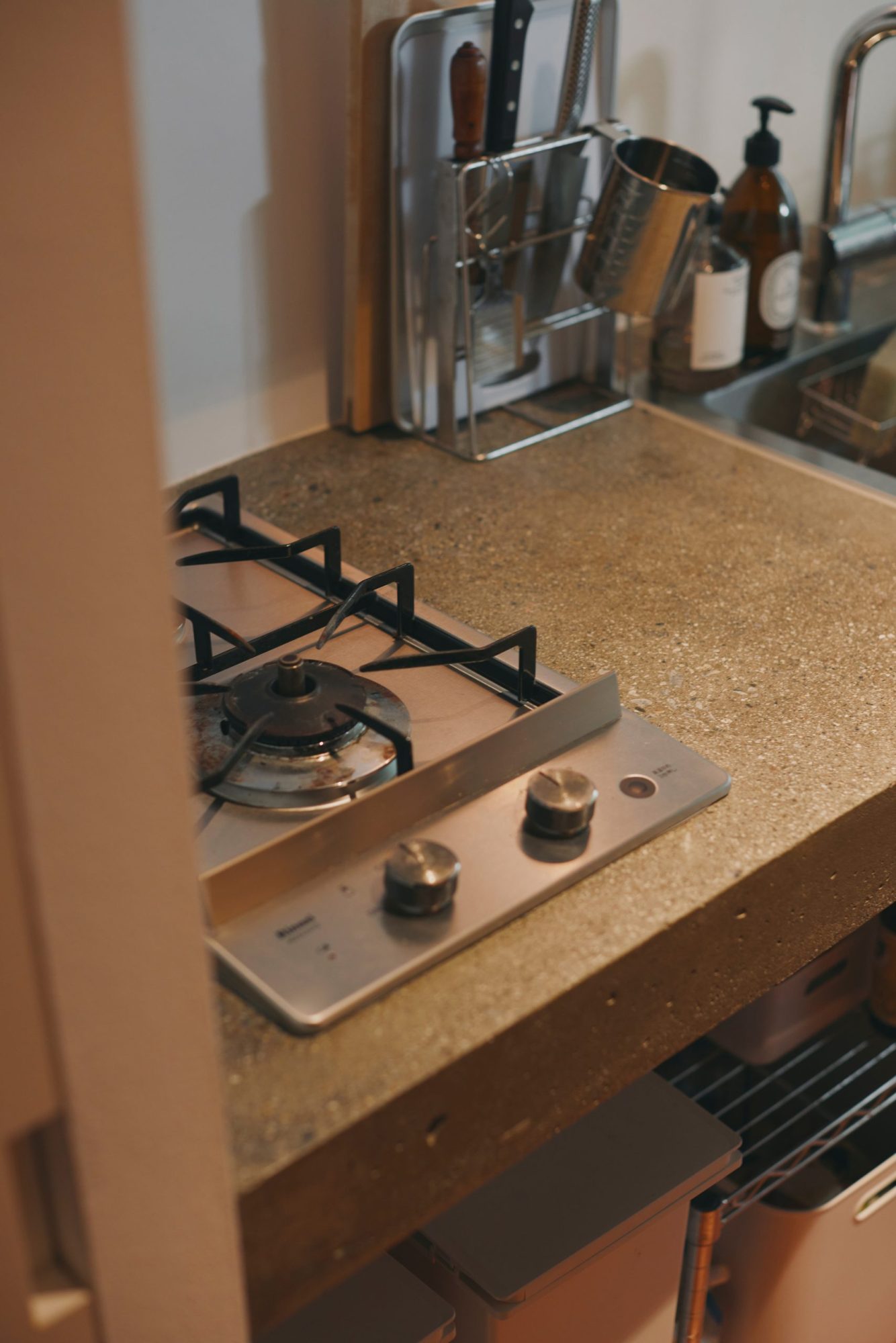 大城家のキッチンカウンターは建築との相性や造作のしやすさから、コンクリートの研ぎ出しに。そこに組み入れたのがリンナイのガスドロップインコンロです。