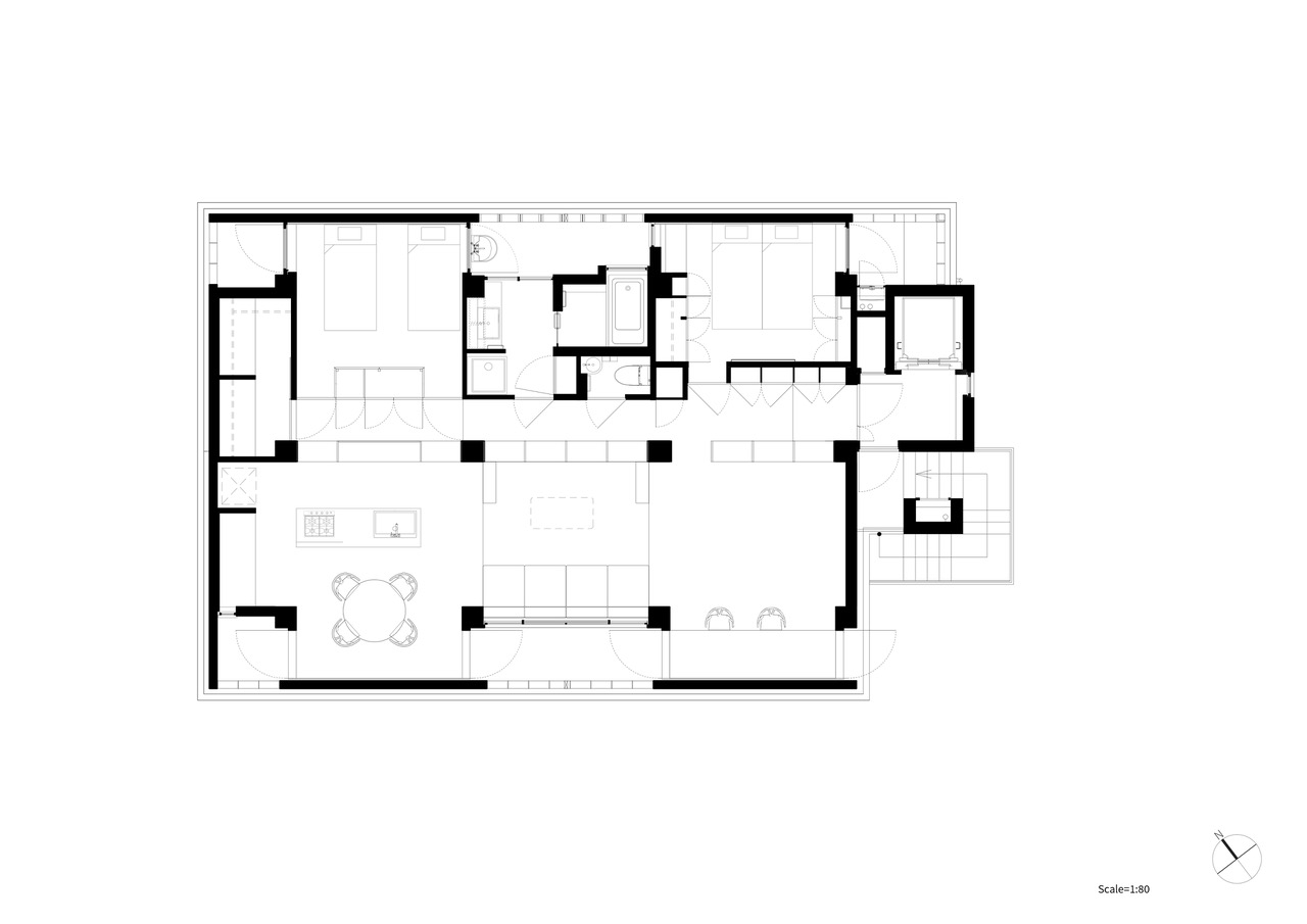 400mmを基準にしたことで、建物を「400」と名付けた大城さん。この発想により、2階(大城さん夫妻)、3階(ご両親)、4階(弟さん)の3つの住居にはレイアウトの自由度が生まれ、家族構成や暮らし方に応じてそれぞれの居室が個性豊かなものに仕上がっています。