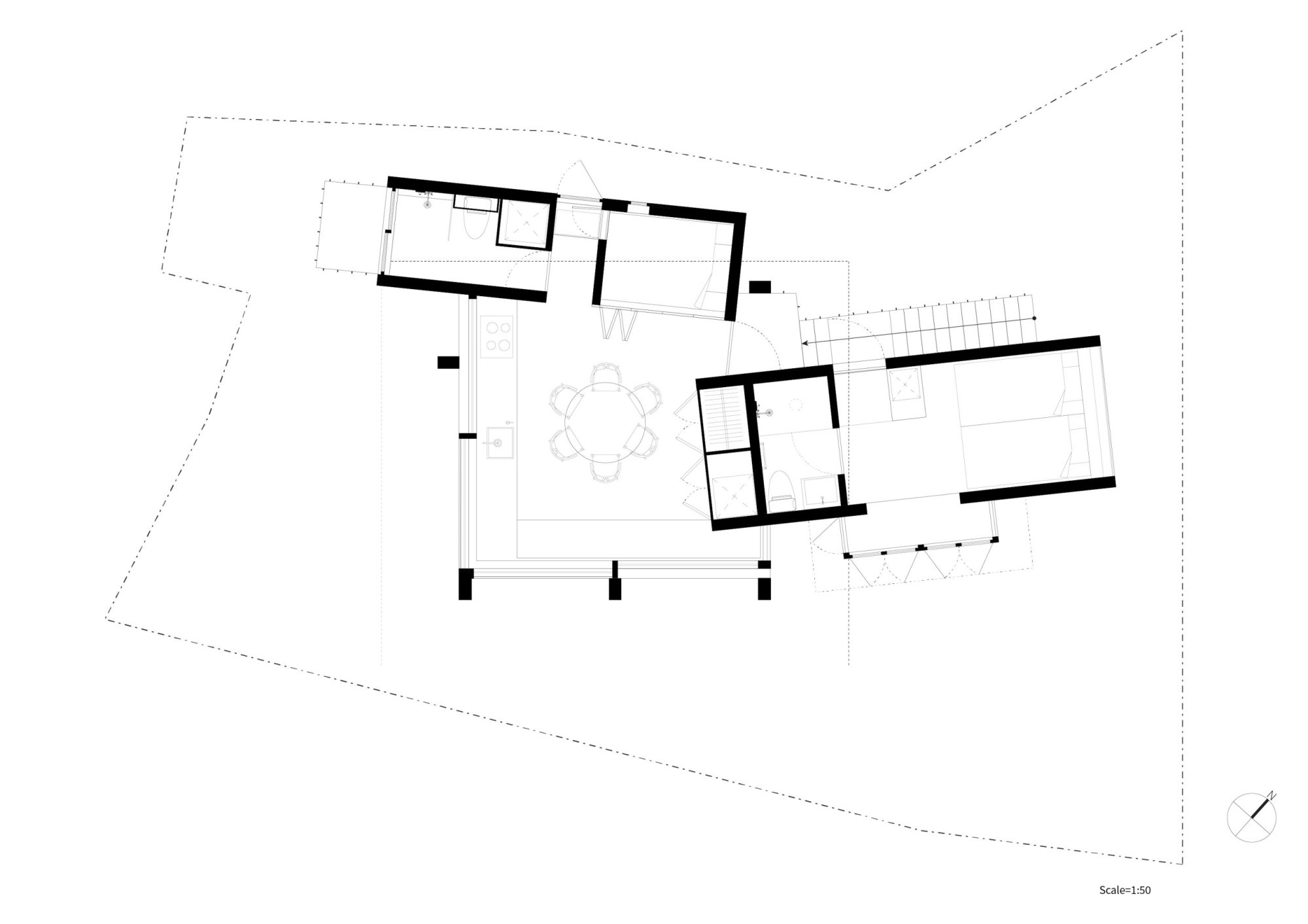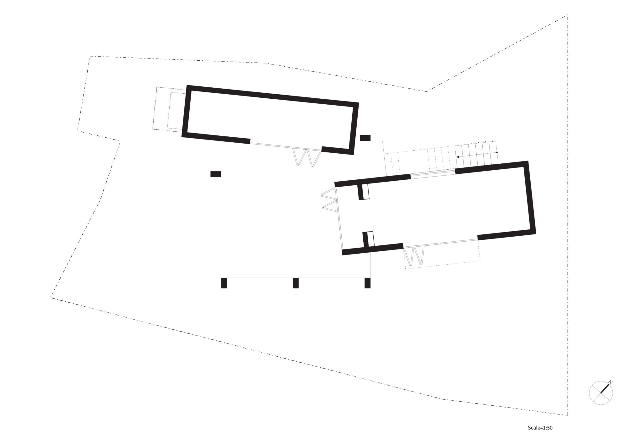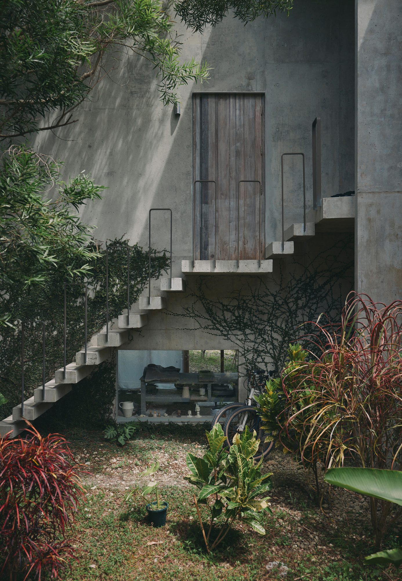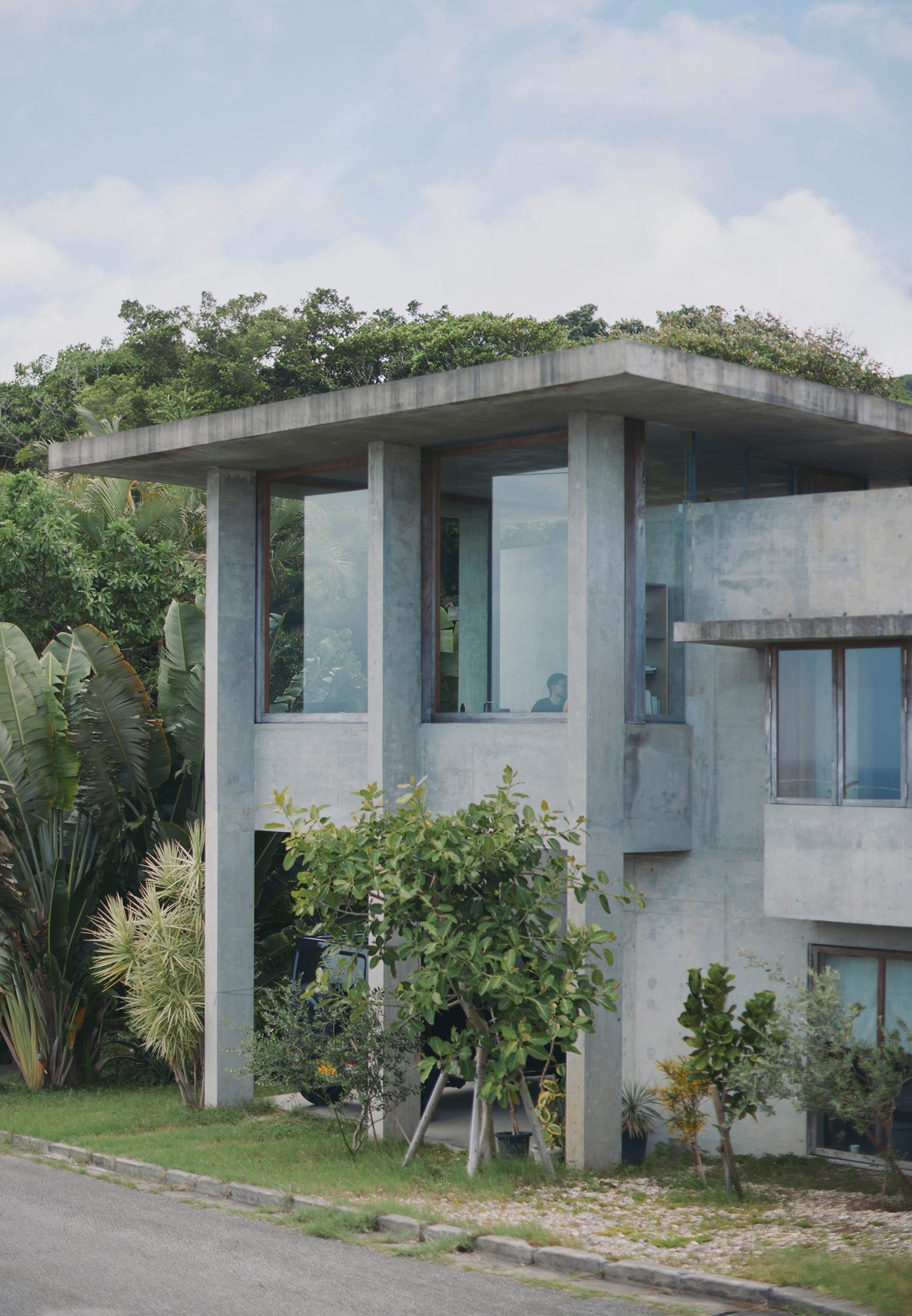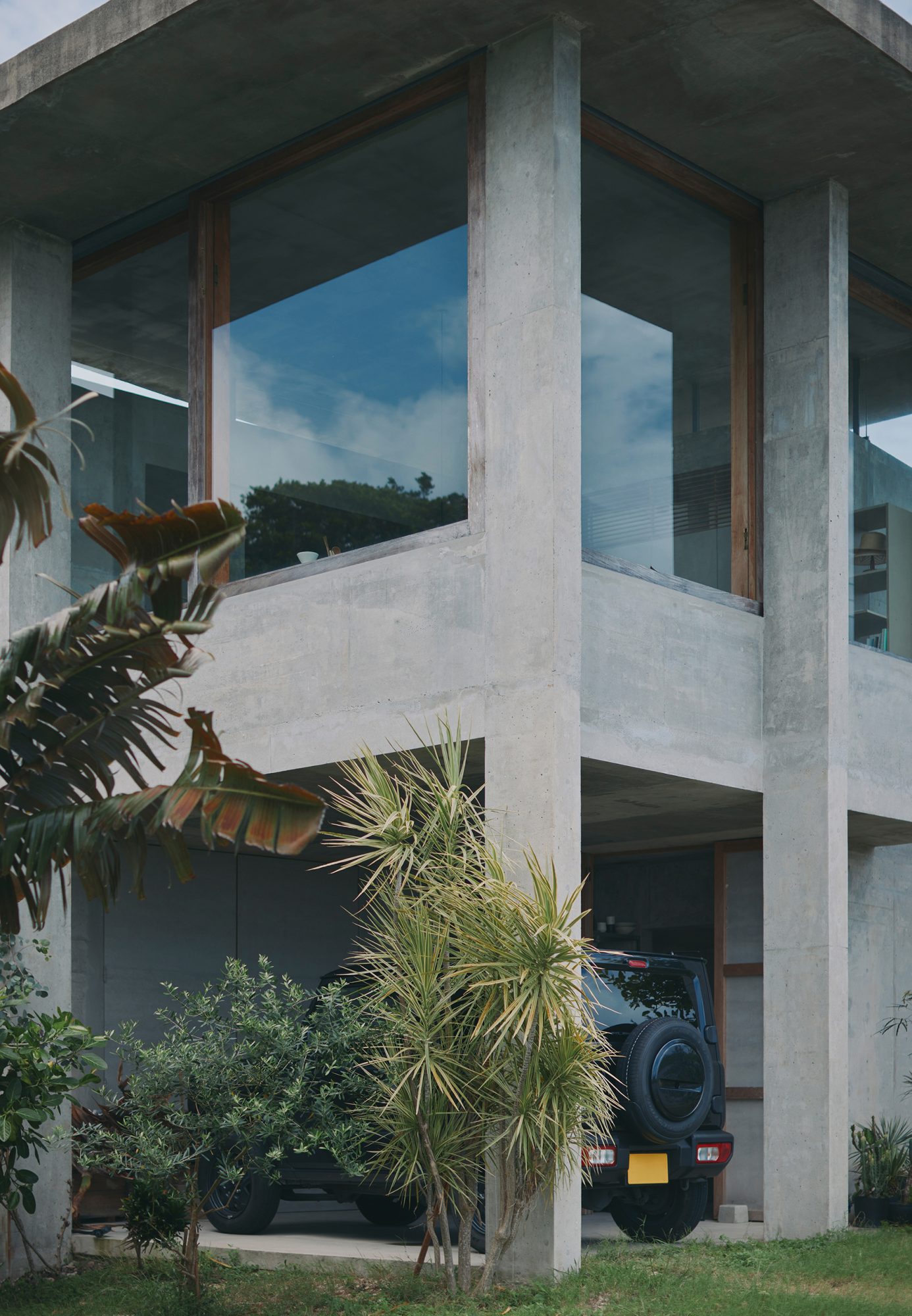 中村さんが求める小さな空間に、いかに豊かな環境を最大限に取り入れるか。五十嵐さんが考えたのは、プライバシーの調和を丁寧に読み解きながら、土地に対して緩くくの字に折れ曲がったような建屋でした。1階には、半屋外のピロティの両脇に2つの工房を設置。2階には、大きなガラス窓を持つ開放的なワンルームを構え、その脇に来沖した友人が気兼ねなく宿泊できるように、エントランスと水回りを別にした小さな客間も用意しました。