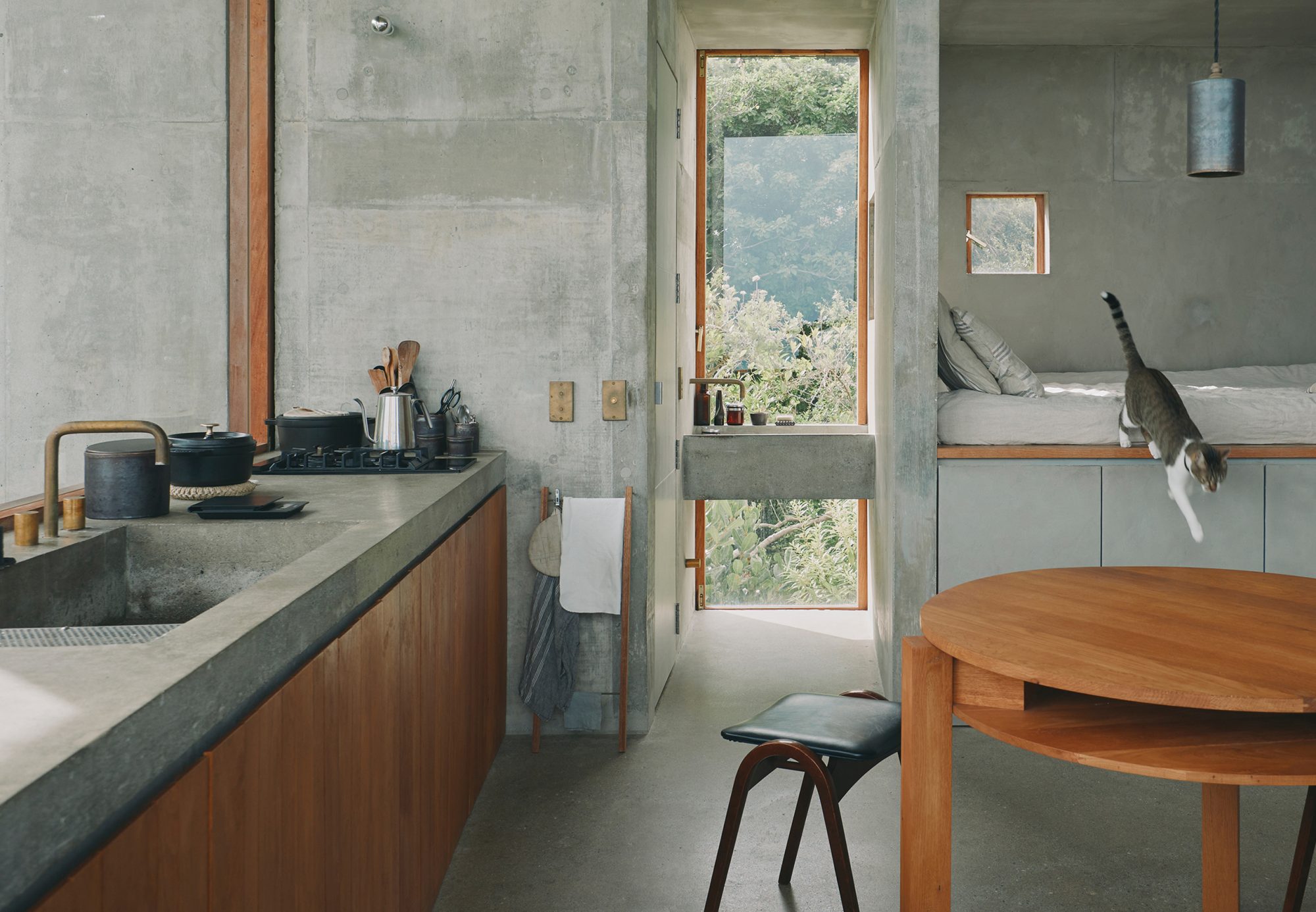 23㎡とコンパクトながら、海を一望する大窓を構えるリビング&ダイニングで合理的かつ快適に過ごせるようにと構造体を有効に活用。特に凹凸をつけてコンクリートを研ぎ出してこしらえたキッチンカウンターやベンチシートは圧巻です。
